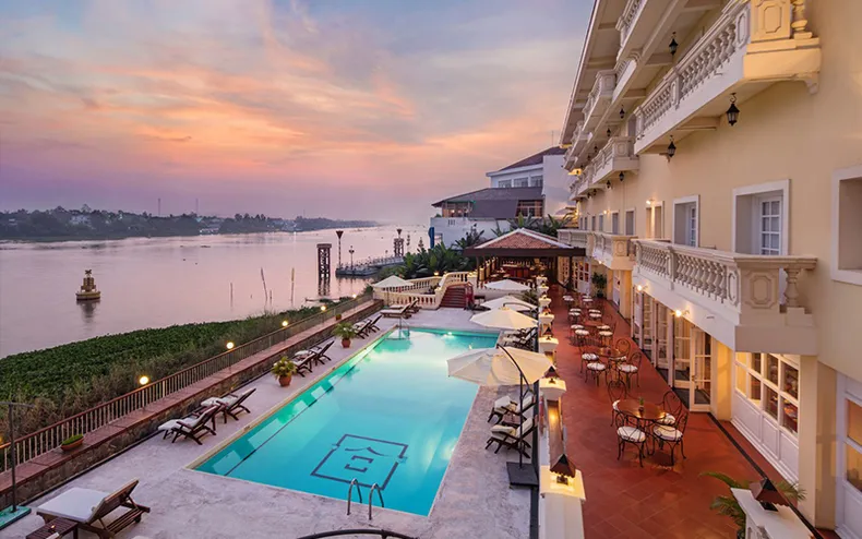 Khách sạn Victoria Châu Đốc được đánh giá là một trong nhiều khách sạn chất lượng khi du khách có nhu cầu tìm kiếm khách sạn An Giang. Với vị trí mặt tiền đắt giá ngay cạnh bờ sông Hậu, view của các phòng trong khách sạn đều mang vẻ đẹp vô cùng tuyệt vời. Các phòng nghỉ đều được trang bị đầy đủ tiện nghi với thiết kế nội thất sang trọng, hiện đại, hồ bơi có diện tích lớn. Khi đến nghỉ dưỡng tại Victoria Châu Đốc, du khách sẽ có cơ hội thưởng ngoại quang cảnh hoàng hôn trên sông tuyệt đẹp. Ngắm nhìn hoạt động thường ngày của người dân nuôi cá bè trên sông  hay ghé thăm các khu chợ nổi tiếng,…
