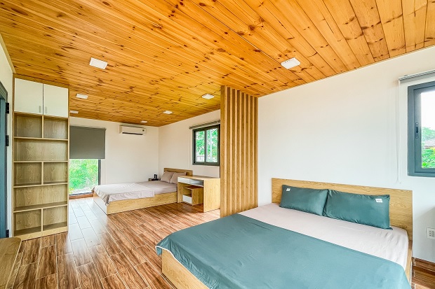 Các phòng ngủ tại Maian Riverside mang nét đẹp vô cùng thơ mộng. Với các tông màu pastel, kết hợp cùng nội thất gỗ, mỗi căn phòng đều đẹp như trong mơ với tầm nhìn ra vườn xanh mát. Ngoài ra nơi đây còn có hồ bơi cho bạn tha hồ giải trí và thư giãn.